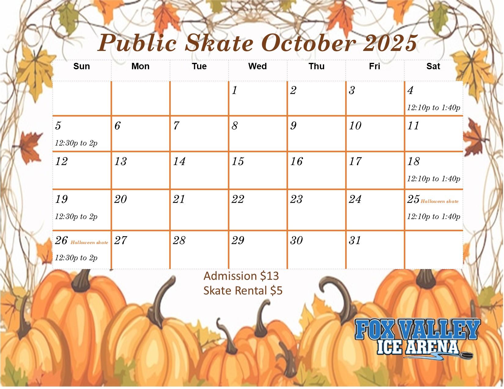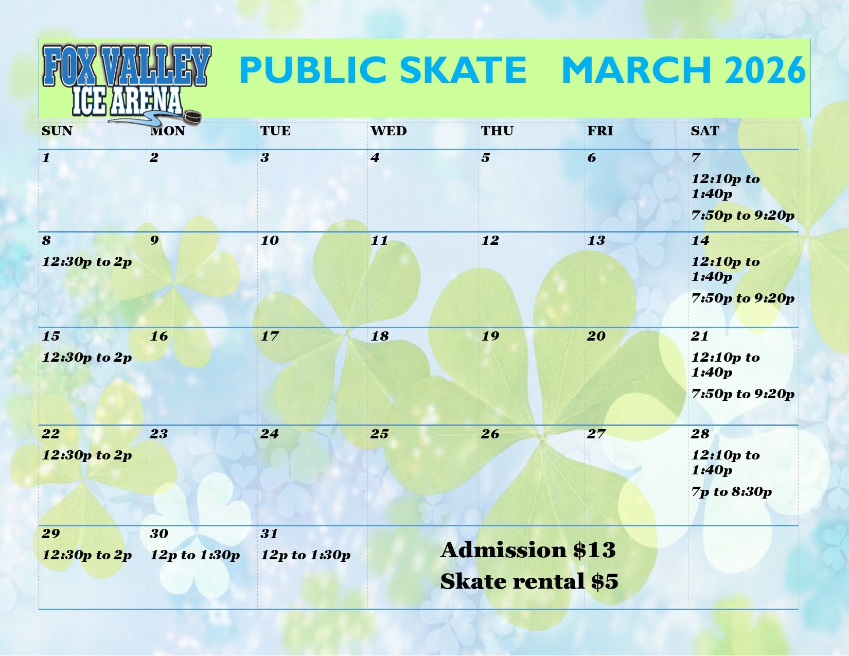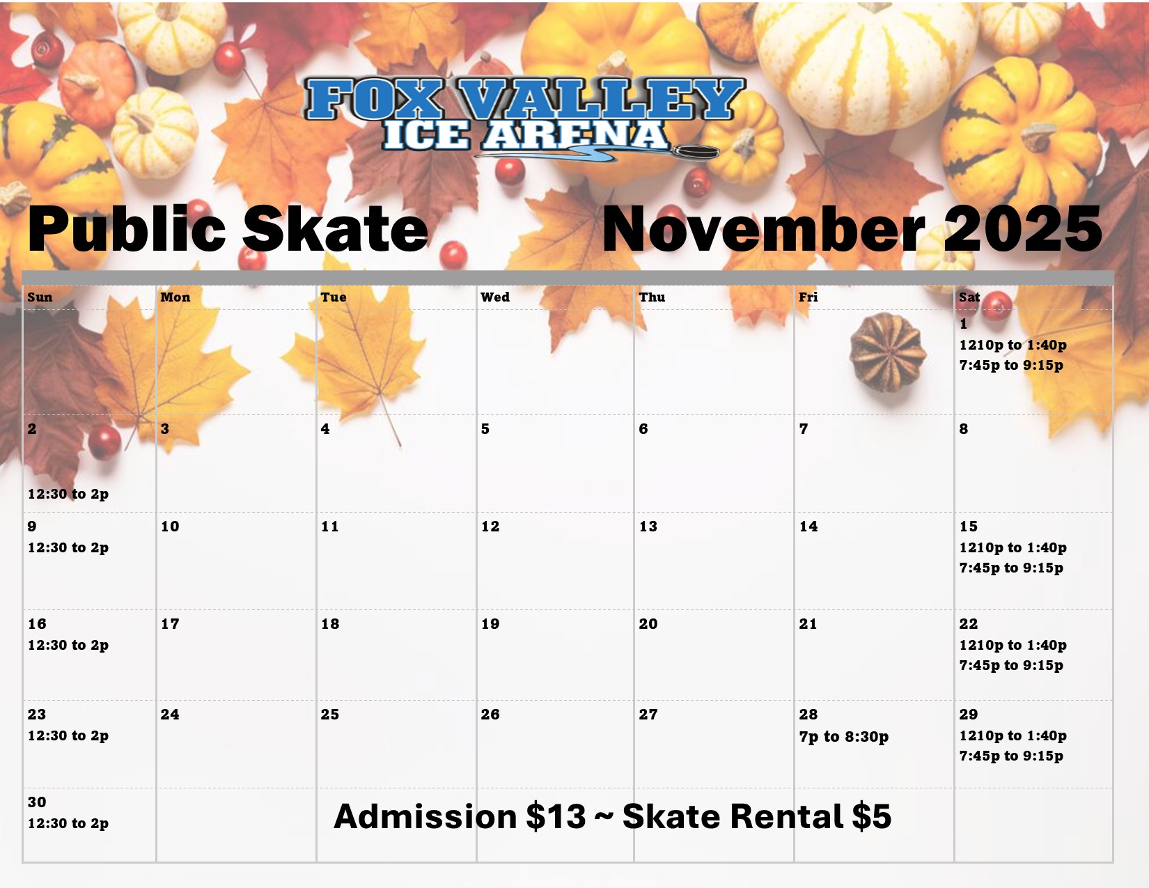 Fox Valley Ice Arena has Public Skate all year long and on days off school! Bring your family and friends for a fun and inexpensive activity. Reserve your spot online now!